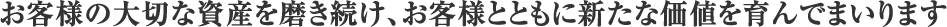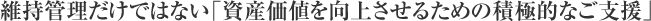 弊社の使命は、「お客様の大切な資産の価値を磨き高めること」です。このため「最適な維持管理」はもちろんのこと、「マンションの資産価値を向上させるための積極的なご支援」も我々の務めと考えております。