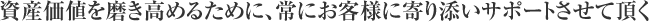弊社は、「価値向上のための積極的なご支援」を目指し、それぞれのマンションに潜在する土地、空間の利用価値を最大限に発揮できる運用方法を模索し続け、お客様にご提案してまいります。